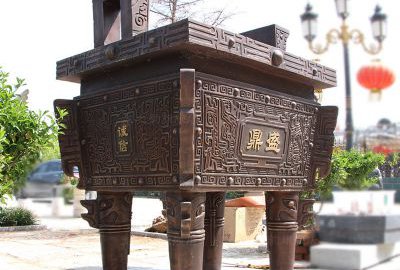 中國(guó)最著名的青銅鼎是鑄造于商朝的司母戊大方鼎,重量大約08噸,現(xiàn)在陳列于國(guó)家博物館內(nèi)。在濟(jì)寧大運(yùn)河北岸,四足四方鼎雕塑,也有一個(gè)青銅鼎,名為任城寶鼎。此鼎高度為506米,重量為8噸,大約是商朝司母戊大方鼎的十倍。任城寶鼎旁邊有一個(gè)巨大的書(shū)籍型的石刻,根據(jù)這個(gè)石刻上的文字介紹,這個(gè)鼎是目前世界上最大的青鑄造四足四方鼎雕塑。